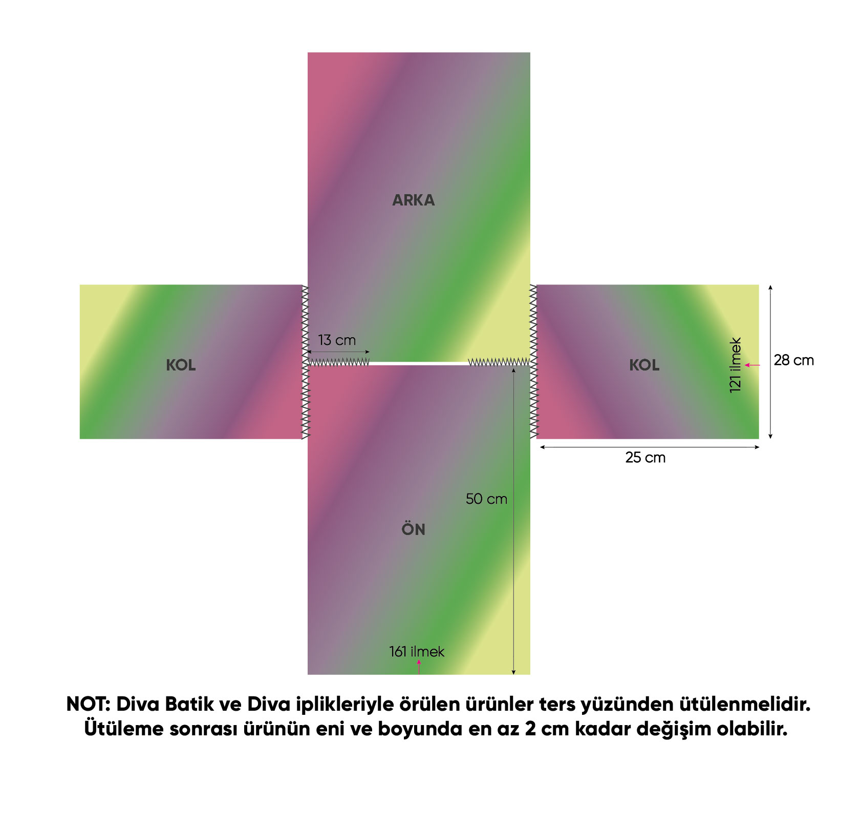 Örülen parçalar düzgünce hizalanır, omuzların ve kolların bedene şemadaki gibi yerleştirilip dikilerek birleştirilir. Sonra