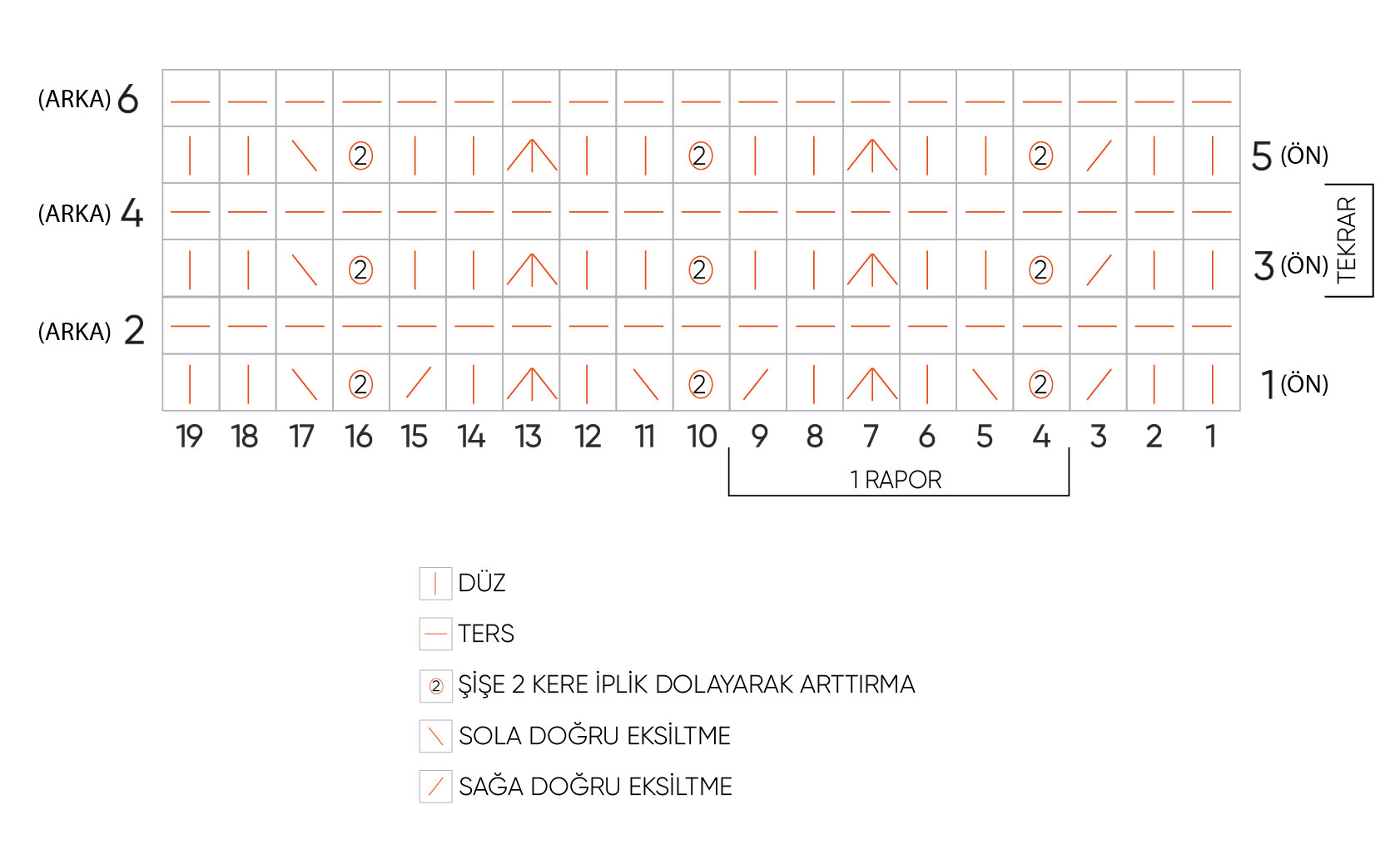 3 ilmeği birlikte düz ör, 1 düz, 2 ilmeği birlikte sağa doğru düz ör* iki yıldız arası sıra sonuna kadar tekrar edilir. Sıra sonu