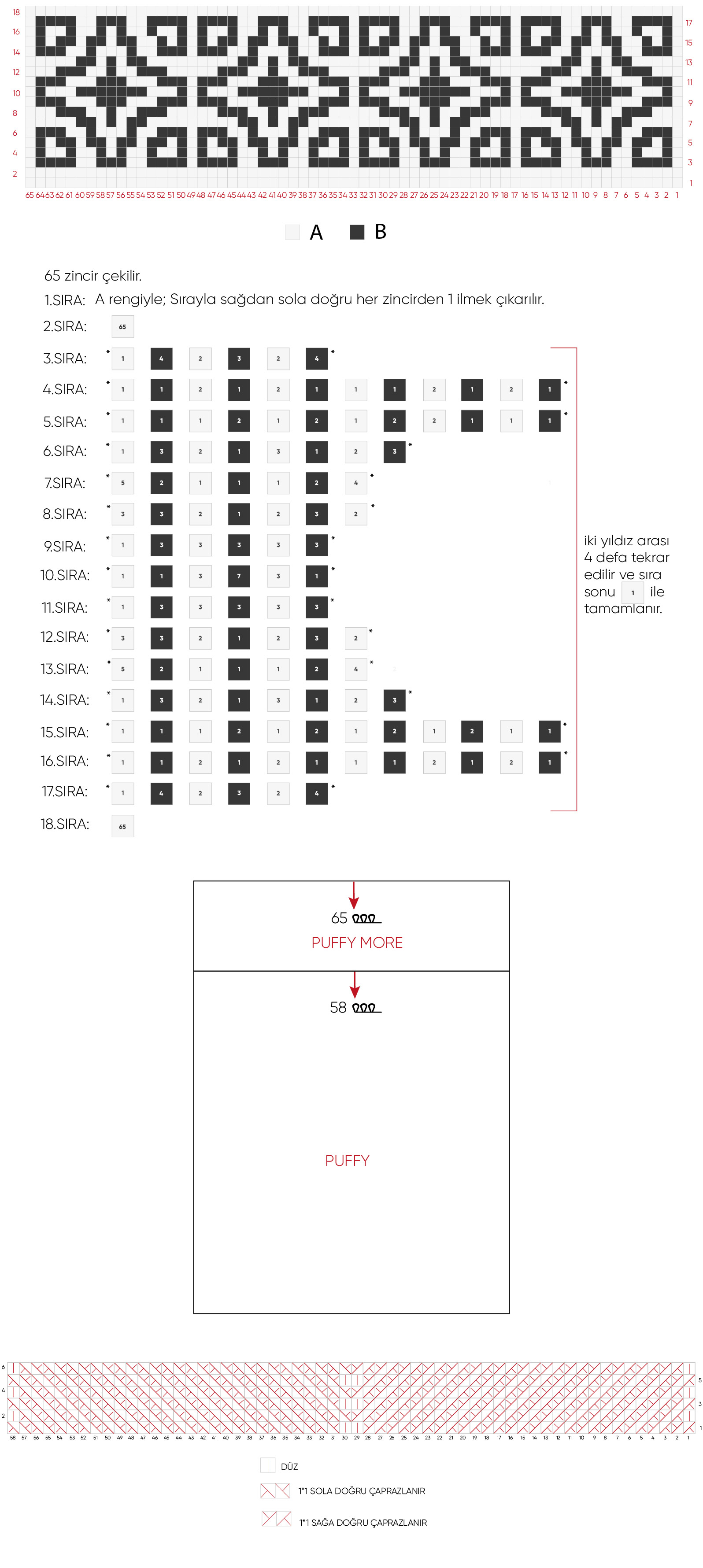 şekilde 31. ilmekle çaprazlanır (sola doğru) ve düz örülür* iki yıldız arası 14 defa tekrar edilir sıra sonu 1 düz ile tamamlanır.